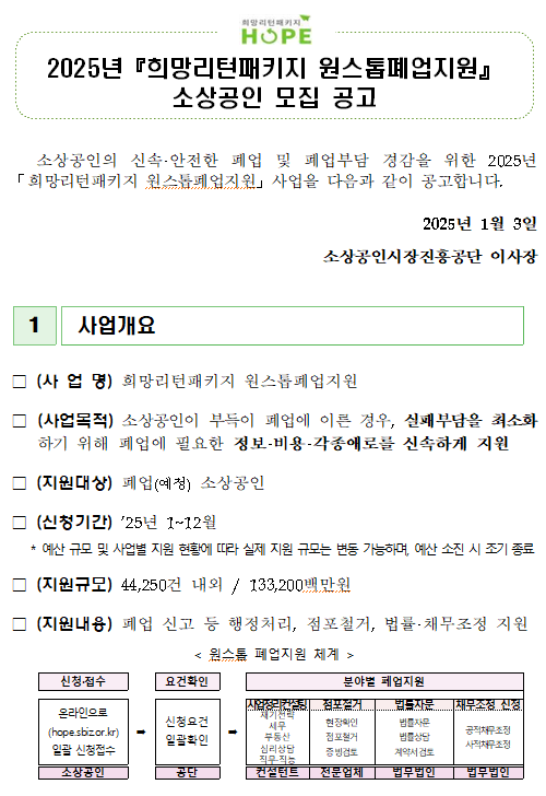 지원 내용: 폐업 절차 안내, 세금 정산, 법률 상담 등