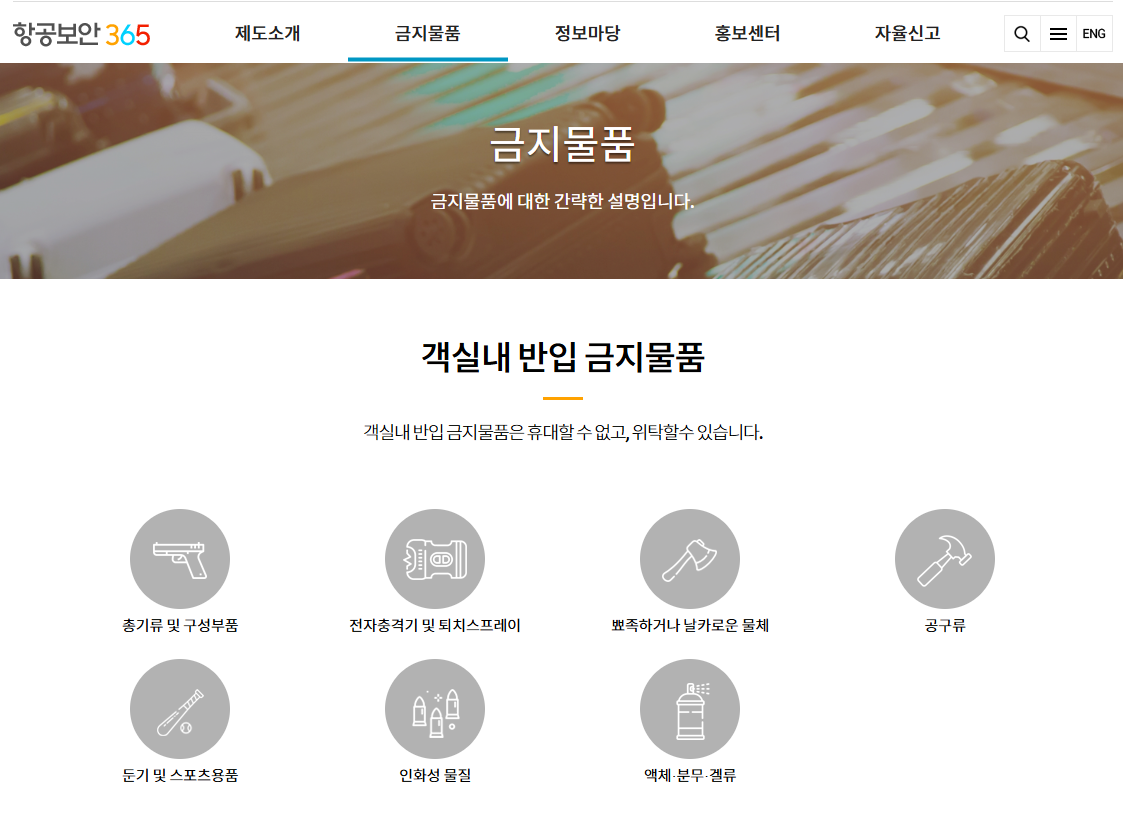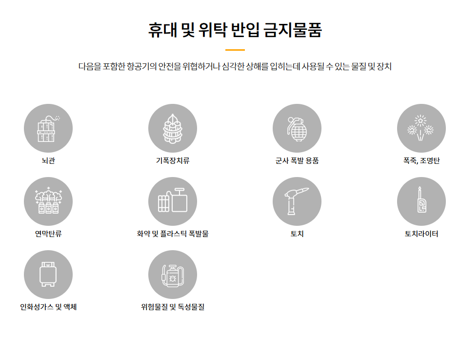 사이트에 들어가 보면 ‘객실 내 반입 금지 물품’, ‘휴대 및 위탁 반입 금지 물품’이 잘 정리되어 있습니다.