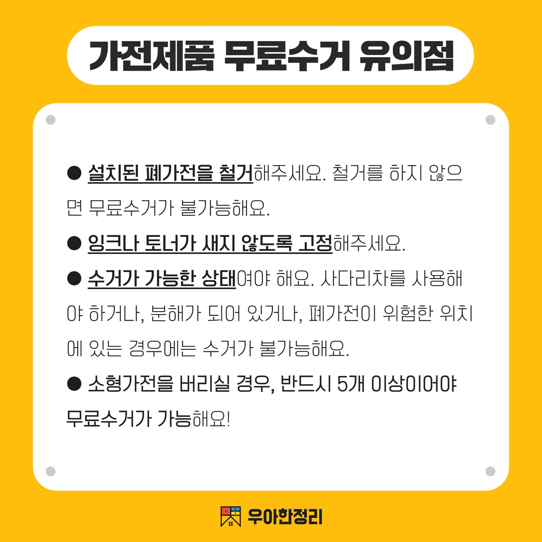 먼저, 수거할 가전제품은 반드시 전원이 꺼져 있어야 하며, 누수나 손상이 없어야 안전하게 수거할 수 있습니다.