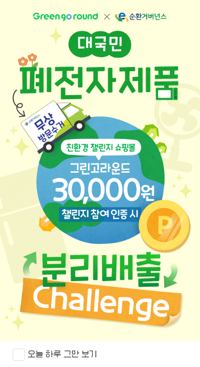 처리곤란하거나 버리는 것도 돈이 들어 집 한구성에 쌓여있는 폐전자제품 무상방문수거하고 그린고라운드로 인증하면 쇼핑포인트 30,000P을 지급해드리는 이벤트입니다. 폐가전제품 무상으로 버리고 쇼핑포인트도 받아가세요!
